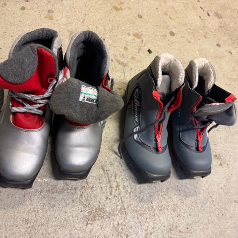 Salomon Junior 166cm hiihtosukset ja Salomonin arviolta 38 kokoa olevat monot sekä Rex apollo sauvat.