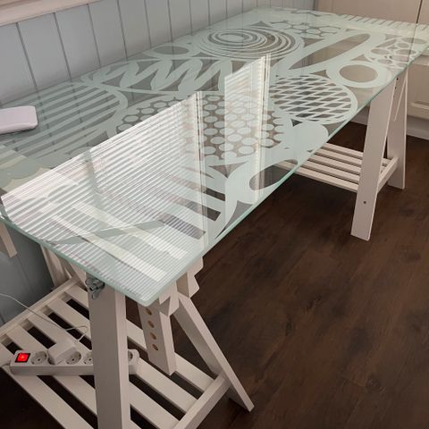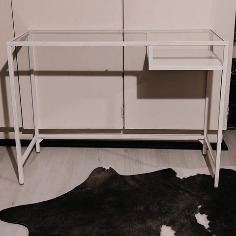 Musta lasikantinen työpöytä, metalliset jalat ja laatikosto. Sopii hyvin koululaiselle tai pieneksi toimistopöydäksi.