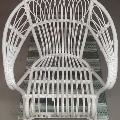 Lumikenkätuolit rottinkia. Olleet valkoiset, osasta maali hiottu pois. Muuten hyväkuntoiset, käsinojasta rottinkipunos löysällä, pieni pätkä rottinkia katkennut toisesta käsinojasta. 3 lumikengän yhteishinta.