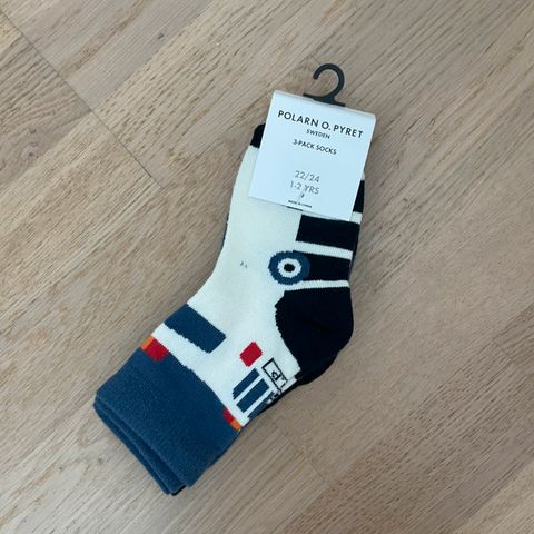 Polarn O. Pyret raidalliset sukat pakettina, koko 22-24, mutta vastaa hieman pienempää (~18-22?). Nimikoitu kangastussilla. Alimman rivin sukat ovat hyvin kuluneita ja ne saa halutessaan kaupan päälle.