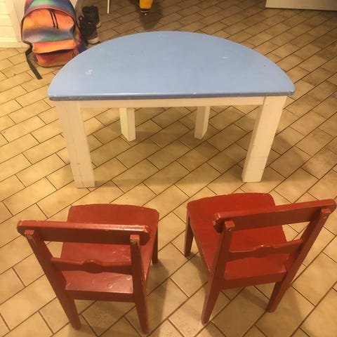 Myydään lasten pöytä ja tuoli, joissa näkyvissä käytönjälkiä. Pöytä on Ikeasta: korkeus n. 49cm ja pinnassa näkyy taiteiluista jääneitä jälkiä enkä ole yrittänyt niitä erityisesti.