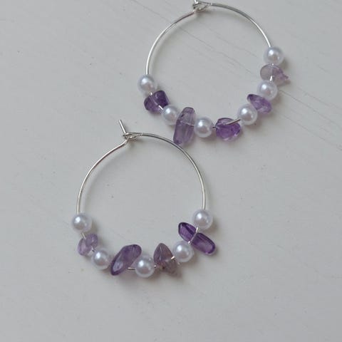 Metallirenkaista tehty kaulakoru, jossa violetti helmirykelmä.