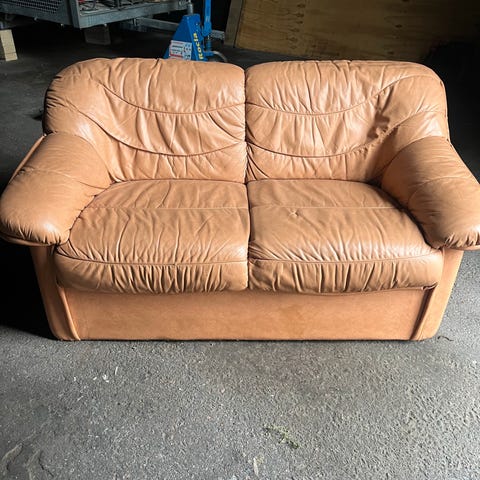 Myydään vanha vaalea kolmenistuttava nahkainen sohva.