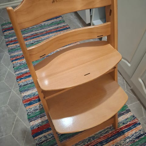 Kuvan mukainen kokoon taittuva, siisti, keinonahkaverhoiltu, harmaa syöttötuoli. Istuimen korkeus säädettävissä.