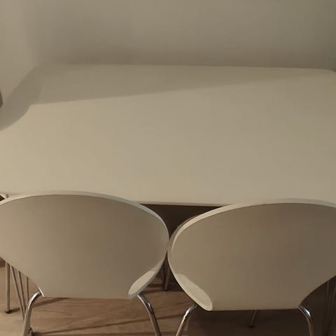 Valkoinen ruokapöytä, suorakulmainen muoto, lisäksi neljä tuolia. Kunto hyvä, joitakin normaaleja käytön jälkiä on. Kuusi tuolia mahtuu hyvin. Myydään muuton takia, vain nouto.