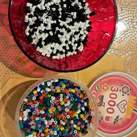 Käytettynä ostettu setti hamahelmiä. Erilaisia värejä ja malleja. Yksi avaamaton pussi.