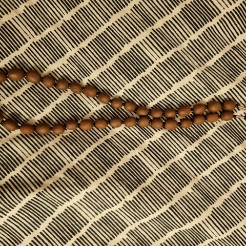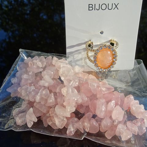 Pienistä ruusukvartsihelmistä ja niiden välisistä pienistä tummista helmistä muodostunut helminauha.