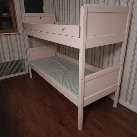 Yläsängyn pohjasta on naru irtoillut (kuva), mutta ruuvattu lautoja kiinni, jottei putoile. Tarroja ja lasten tekemiä merkintöjä löytyy ympäriinsä. Ei olla jynssätty puhtaaksi tai koitettu poistaa tarroja. Patjat saa halutessaan mukaan.