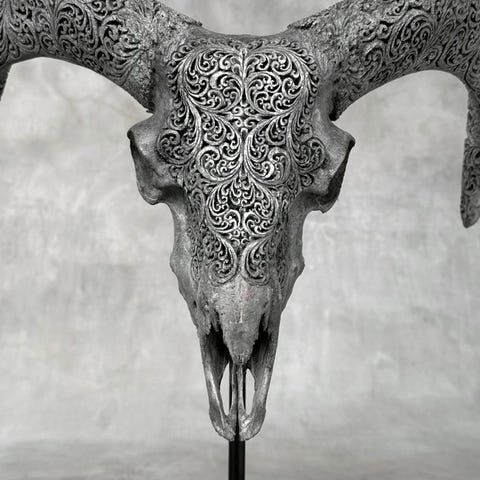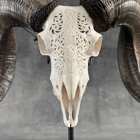 Veistetty pässin pääkallo jalustalla. Kallo on täysin leikattu pois kauniilla kuvioinnilla. Se toimitetaan räätälöidyn mustan rautapylvään kanssa, ja sen voi halutessaan irrottaa tästä pylväästä.