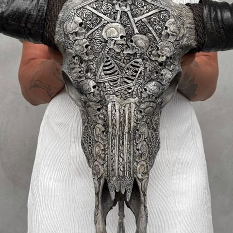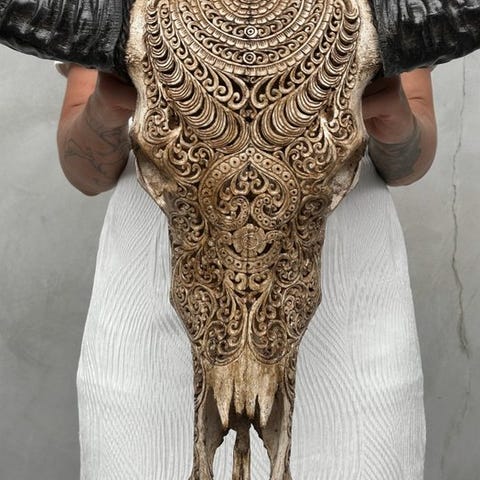 Tämä suuri käsin veistetty vesipuhvelin pääkallo on upea kodin sisustusesine, joka elävöittää minkä tahansa kodin tai ravintolan. Se on enemmän kuin vain henkinen ja kulttuurinen taideteos; se kertoo myös Indonesian alkuperäiskäsityöläisten tarinan, jotka säilyttävät paikallisen käytännön käyttää jokainen osa eläimestä ikuisen työn taiteen luomiseksi. Tämä pääkallo on käsin tehty Indonesiassa, missä eläinpääkalloihin kaivertamisen taito siirtyy isältä pojalle. He ovat hallitseet tätä ovelaa tekniikkaa ja tarvitsevat noin 4–5 päivää kaiverrellakseen erilaisia kuvioita pääkalloihin.