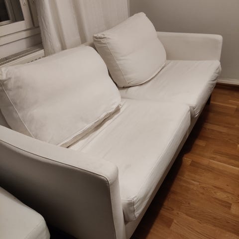 Annetaan elämää nähnyt kulmasohva, kankaissa ei ole reikiä, eikä talossa ole ollut koiria eikä kissoja. Sohva menee kahteen osaan. Selkänoja tyynyissä vetoketjulla irroitettavat ja pestävät päälliset. Sohvaa on myös pesty säännöllisesti tekstiilipesurilla