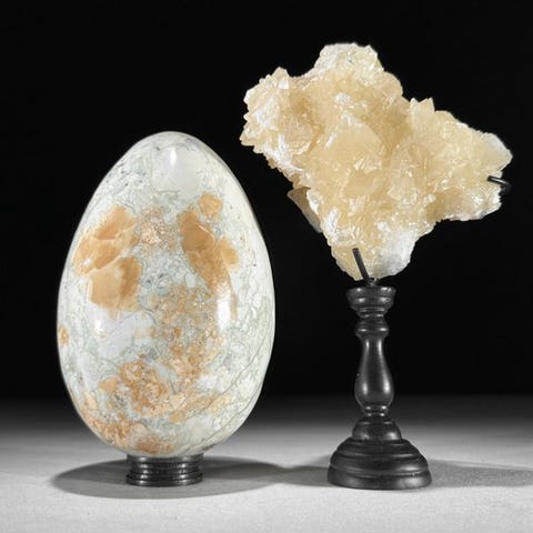 Upea kalsiittikiteiden ryhmä ja pyriitti räätälöidyllä jalustalla.