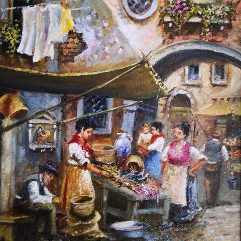Mestari Grimaldin upea ja kaunis öljymaalaus kankaalle, 40 x 50, kuvaa Positanon rannikon kaunista nurkkaa (Kaunis).