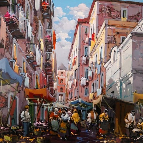 Kaunis ja näyttävä öljy kankaalle, mitat 24 x 30, mestari Salvatore Montellan teos. Esittää kauniin kulman Napoliä, ja kauniit värit osoittavat erinomaisen maalaustaidon. Alareunassa ja takana on taiteilijan allekirjoitus.