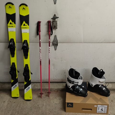Myydään lasten laskettelusetti johon kuuluu sukset, monot ja sauvat. Kuvista näkyy mitat ja koot. Uutena ostettu ja kaksi talvea lasketeltu setti.