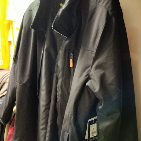Farkkukankaan tapaista kangasta jossa öljykangastakin tyylinen pinta. Hhvä syys- ja kevättakki.