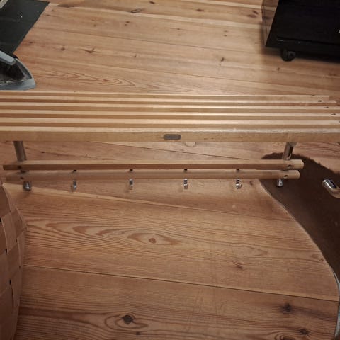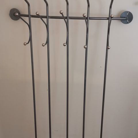 Jämäkkä hattu hylly jossa ripustus koukkuja.