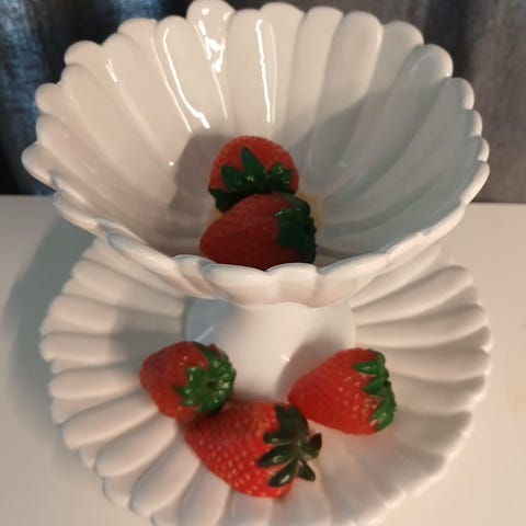 Sekalainen kasa hedelmä/Marja kuvioisia astioita, tarjoiluvati, kirsikkalautasia 5 kpl, mansikkalautanen ja lävikkö