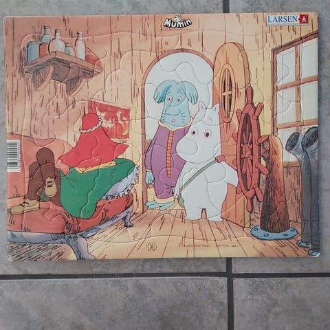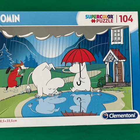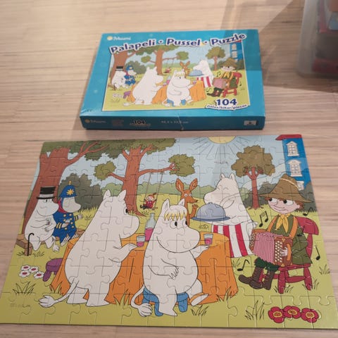 Myydään Muumi palapeli, jossa on 104 palaa. Kaikki palat tallessa ja palapeli hyvässä kunnossa. Laatikon nurkassa pieni repeämä ja reunassa pieni painauma, näistä vioista lähikuvat.