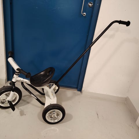 Siinä on renkaat ja ohjaustanko sekä aikuisen ohjaama kahva. Suunniteltu 2–4-vuotiaille lapsille. Kaikki mekanismit toimivat ja ketju on voideltu erityisellä voiteluaineella. Ohjaustangon käsisuojusta täytyy siirtää hieman, mutta se ei vaikuta käyttömukavuuteen. Nouto Kirkkonummelta, Gesterbystä.