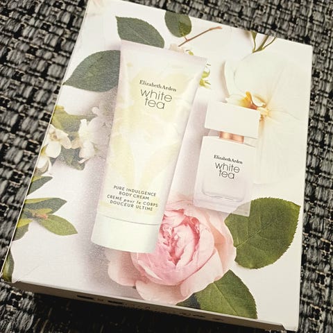 Elizabeth Arden White Tea lahjapakkaus sisältää vartalovoiteen 100 ml ja hajuveden EDT 30ml. Tuotteet on suunniteltu naisille ja ne ovat valkoisen teen tuoksuisia. Avaamaton pakkaus.
