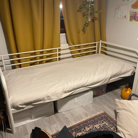 Ikea mäntypuinen levitettävä sänky, johon käy 80 x 200 cm patja(t). Katso mitat viimeisestä kuvasta