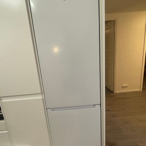Valkoinen jääkaappi, jossa erillinen pakastinosa. Sisältää hyllyt ja ovihyllyt elintarvikkeiden säilytykseen. Kylmätila ja pakastin ovat erillisiä osastoja. Jääkaapin sisäosassa näkyy käytön jälkiä.