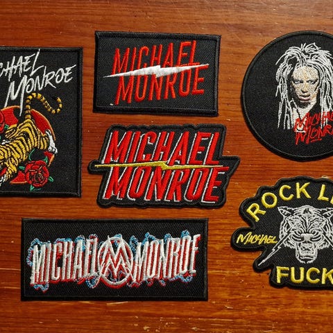 Kuvanmukaiset, hyvässä, uudenveroisessa kunnossa olevat, hartaudella kerätyt, käyttämättömät kangasmerkit HANOI ROCKS / MICHAEL MONROE diggareille.