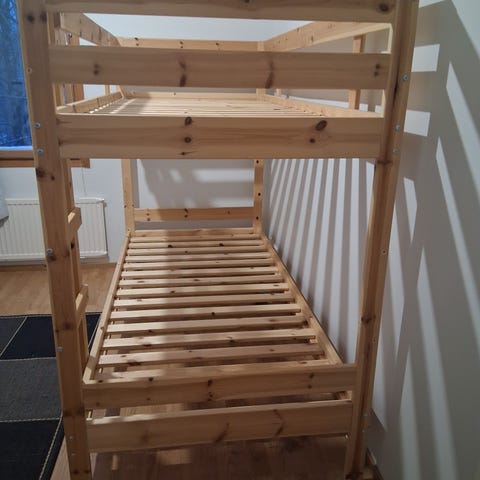 IKEA kerrossänky, jossa ylävuode ja alapuolella työpöytä sekä useita säilytystiloja. Sänky on valmistettu valkoiseksi maalatusta materiaalista ja sisältää metallisen tikkaat ylävuoteeseen kiipeämistä varten. Sopii tilaa säästävään sisustukseen, jossa tarvitaan sekä nukkumatilaa että työ- tai opiskelutilaa.