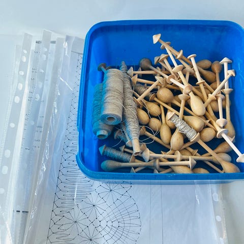 Paketti sisältää useita puisia nypylöitä eri kokoisina, osa langoitettu