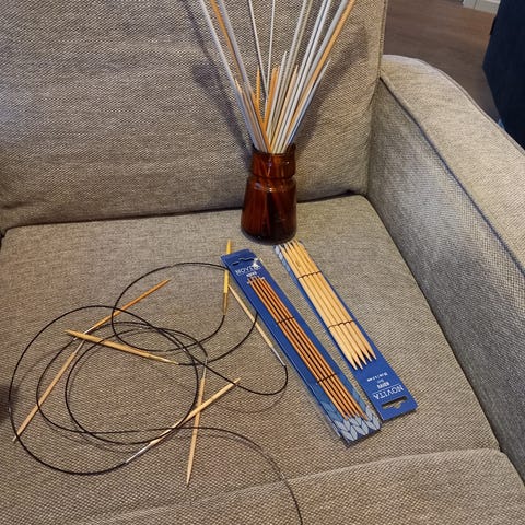 Iso setti eri kokoisia pyörö- ja sukkapuikkoja (bambu ja metalli), muita puikkoja, isosilmäisiä neuloja ja virkkuukoukkuja (metalli ja bambu).