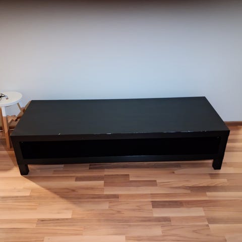 Annetaan tv-taso uuden tilalta pois. Pientä kulumisen jälkeä, mm. pinta ottanut kosteutta parista kohdasta. Eivät kuitenkaan näy kuin läheltä katsoessa.