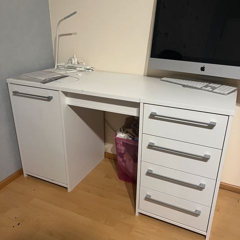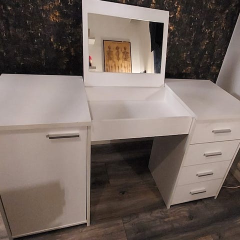 Sotkasta ostettu, kotimainen Fame-työpöytä, jossa peili. Runsaasti säilytystilaa, vasemmalla kaappi, jossa yksi hyllylevy sekä oikealla neljä vetolaatikkoa. Työpöydän taso kääntyy myös ylöspäin ja sen alla on pieni lokero ja kannessa peili. Erittäin hyvin pidetty. Uutena 299€.