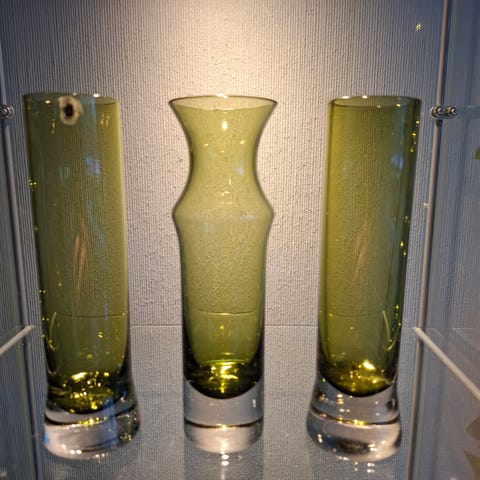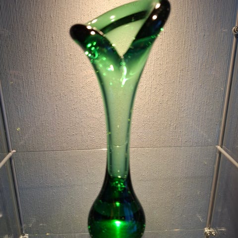 Myydään maljakko E Wänni liekki vihreä, 28cm, laattat 24 karaatin kullalla päällystetty. Ei käytetty kukkamaljakkona, lasi kirkas, ei iskemiä, pohjalla signeerausta.