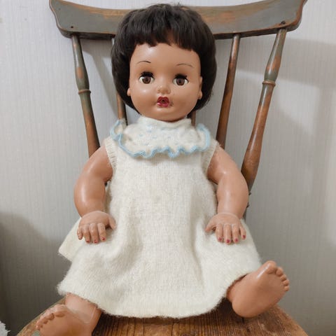 Arviolta 50-luvulta. Silmät avautuvat ja sulkeutuvat. Korkeus 53 cm.