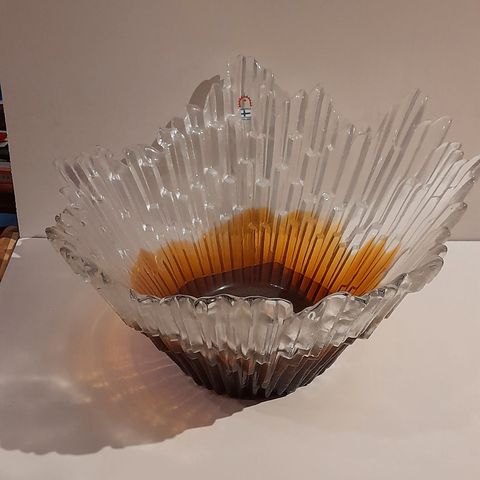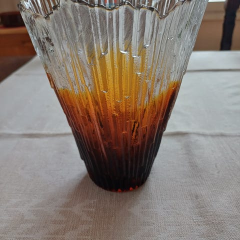 Myydään maljakko Revontuli, kork 27cm, lasi kirkas, pieni iskemä pohjan reunalla, huomioitu hinnassa.