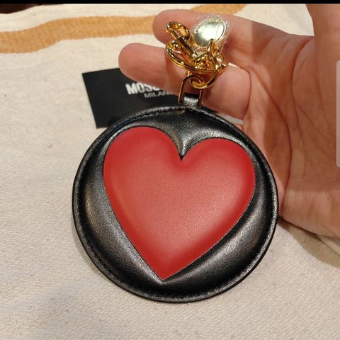 Moschino avainnauhassa on musta nahkainen pyöreä pohja, jossa on suuri punainen sydän. Avainnauhassa on kullanväriset metalliosat, mukaan lukien rengas ja lukko, joissa on Moschino Milano -merkinnät. Valmistettu Italiassa.