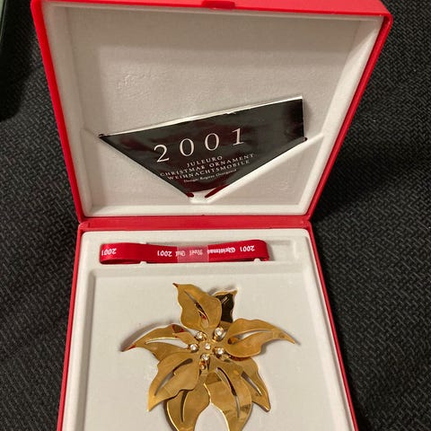 Georg Jensenin joulukoriste joulutähti vuodelta 2001. Tämä on harvinaisempi, valkokullattu versio. Mukaan tulee tummansininen ripustusnauha, valkoinen Christmas Nordica laatikko sekä kartonkilaatikko suojaksi.