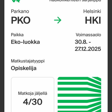 Myydään vr:n aikuisten junalippu Tampereelta Järvenpäähän perjantaina 2.1 klo 8.04-9.47. 1 vaihto Riihimäellä Pendolinista R-junaan. Lipun lähetys sähköpostilla.