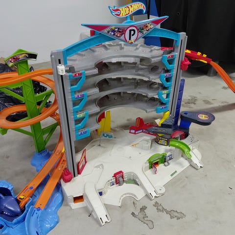 Hot Wheels lasten lelu, joka sisältää monitasoisen radan ja erilaisia liitännäisosia. Sopii lasten leikkeihin ja autojen ajeluun.