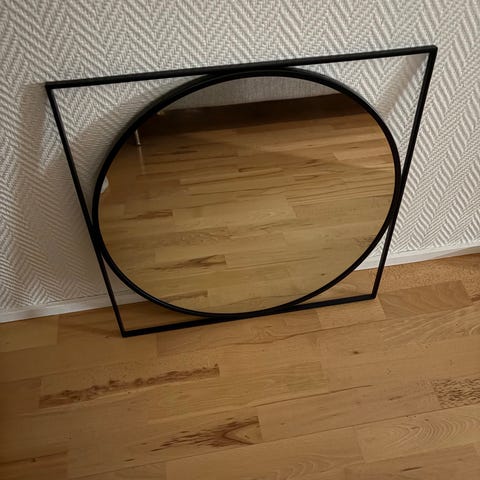 Rusta pyöreä peili, joka soveltuu sisustuselementiksi erilaisiin tiloihin. Peilin kehys on musta, ja sen muoto on pyöreä. Peilin mitta on 85cm
