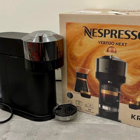 Kerran kokeiltu Nespresson uusi kahvikone + erillinen maidonvaahdotin. Mukaan saa laatikollisen eri makuisia kapseleita (yksi käytetty).