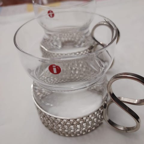 8 kappaletta tsaikka laseja. Kupit ovat läpinäkyvää lasia ja niissä on koristeelliset metalliset kahvat. Soveltuvat kuumien ja kylmien juomien tarjoiluun.