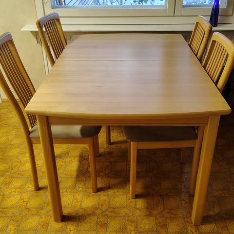 Myydään erittäin siistikuntoinen ruokailuryhmä. Koivua. Pöydän koko 74x119cm. Mukaan 4 tuolia, joissa valkoinen istuinosa. Tuolin korkeus 100cm. Tuoleissa on ollut käytössä erilliset päälliset, joten ei tahroja. Eivät nytky tai natise.