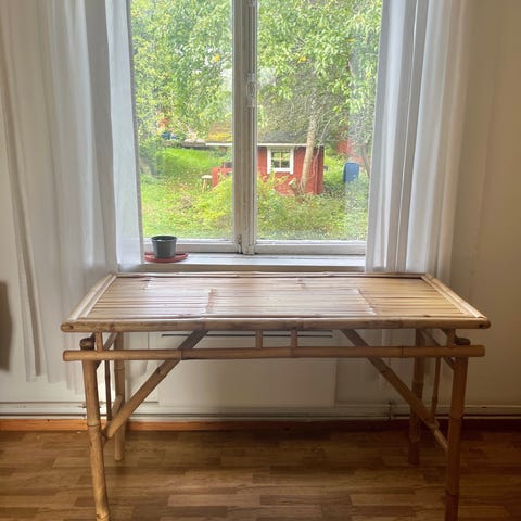 Hieno, suht kevyt ja siro bampupöytä ja täysipuinen painava pöytälevy. Pöytälevy ei kuulu pöytään. Pöytälevyssä pientä sanomista molemminpuolin, mutta on helposti hiottavissa ja käsiteltävissä. Lisäkuvina pöytälevy.