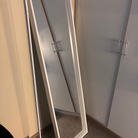 IKEA PS 2014 -pöytäpeili, jossa on valkoinen alusta ja koivupuinen runko.
