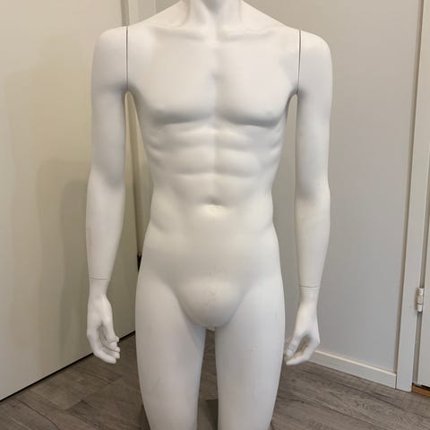Mallinukke. Mallinukke ok- kunnossa. Pinnassa käytön jälkiä. Kädet saa irti. Mallinuken toinen kämmen hajonnut. Kämmenet saa irti.