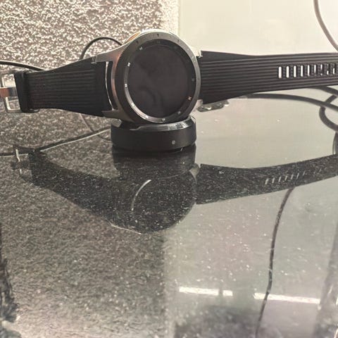 Samsung Galaxy Watch älykello, musta väri, mukana latauskaapeli. Kellossa silikoninen käyttämätön ranneke. Akku kestänyt nykyisessä käytössä n.viikon