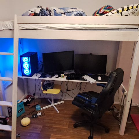 Hyväkuntoinen parvisänky kirjoituspöydällä.
