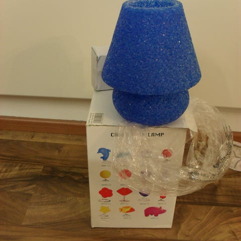 Suuri kirkkaan sininen valo (epäsuora/yövalo/korostusvalo) sisäänrakennetulla LED-valolla (virtalähde USB). Noin 24 x 16 x 16 cm.
